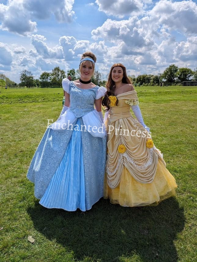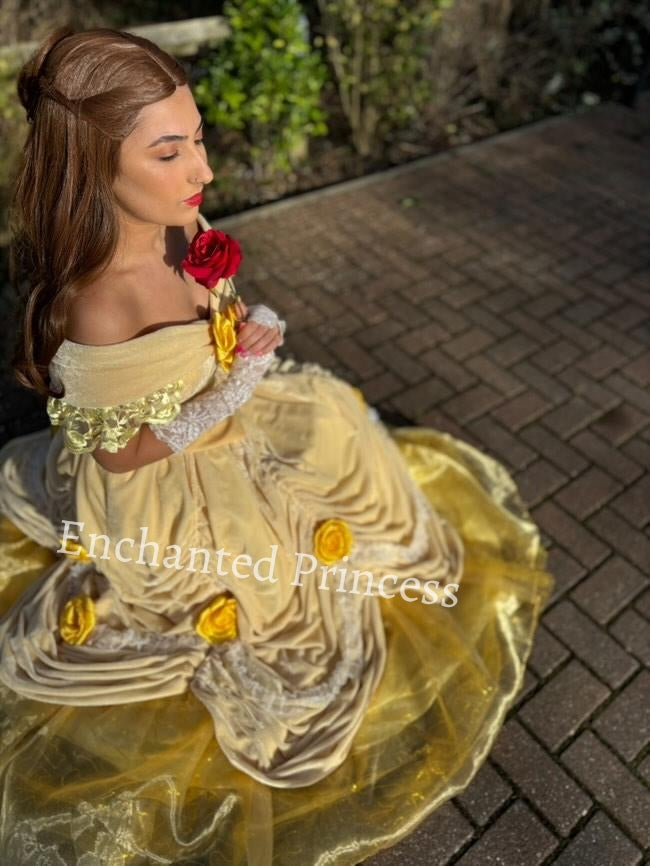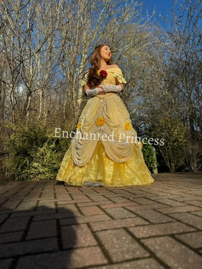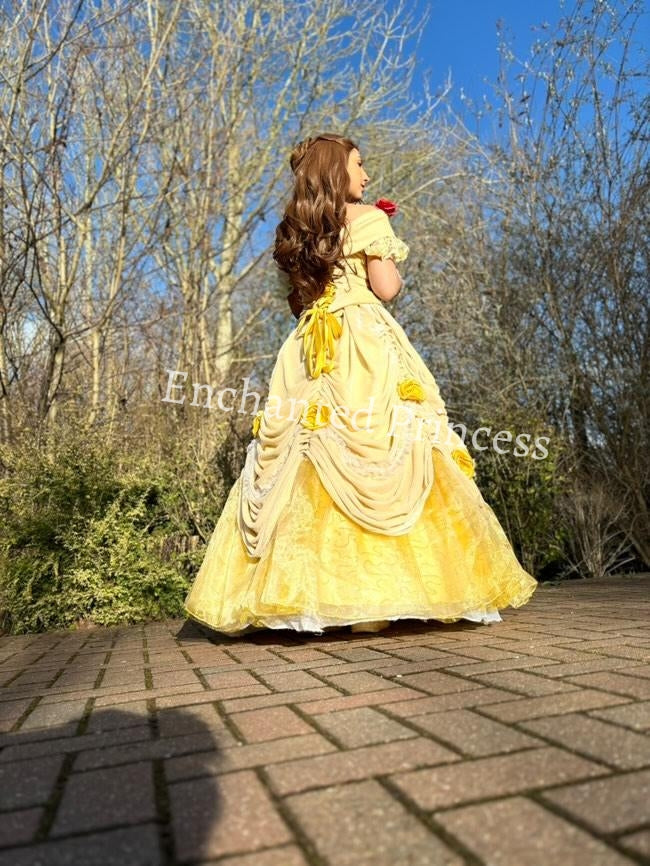 A stunning yellow puffy dress inspired Belle dress in a glamorous shade of yellow using a soft velvet and organza fabric.