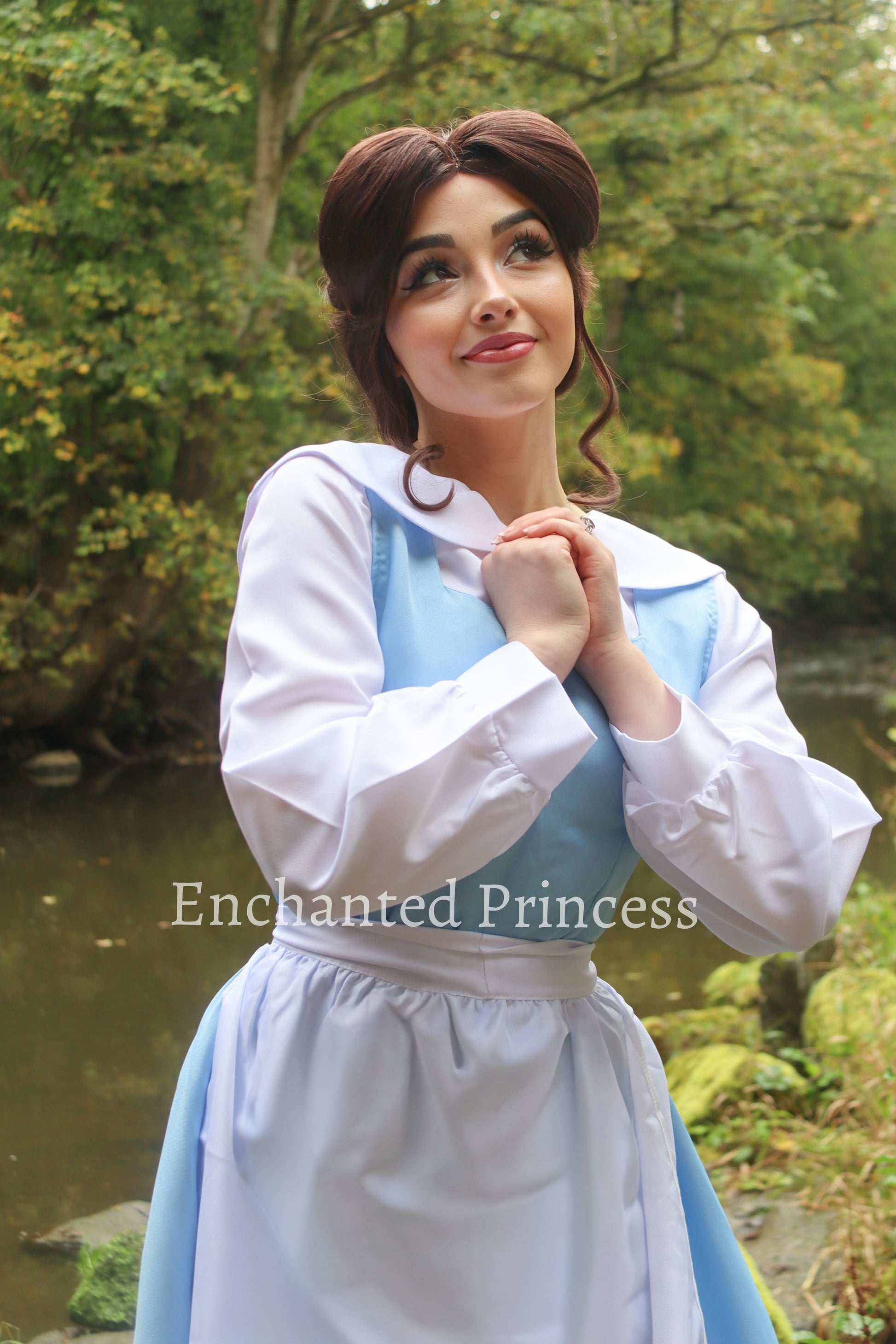 Beauty & The Beast Belle, blue and White maid dress which comes complete with the dress,apron, and blue hair bow.