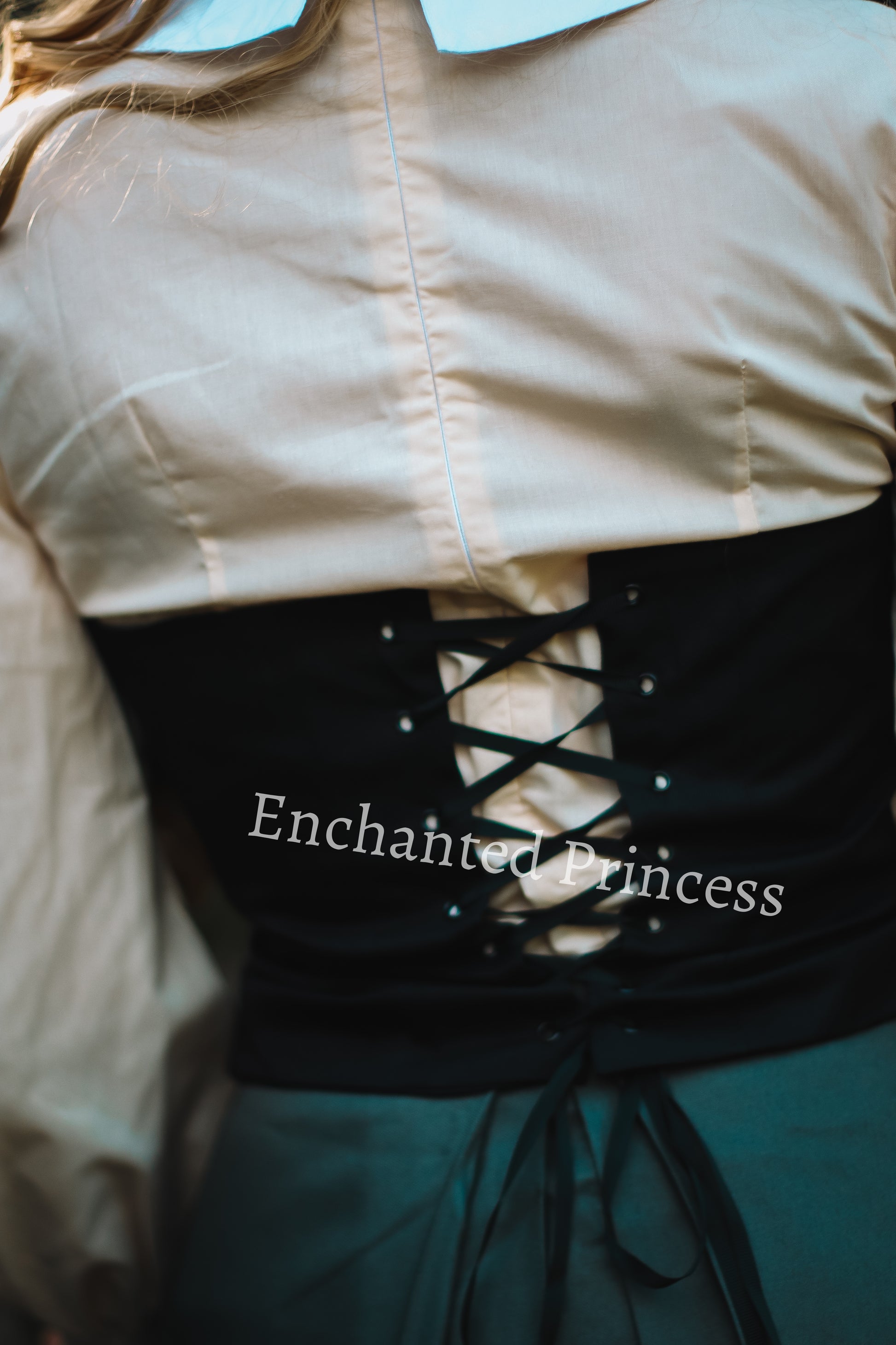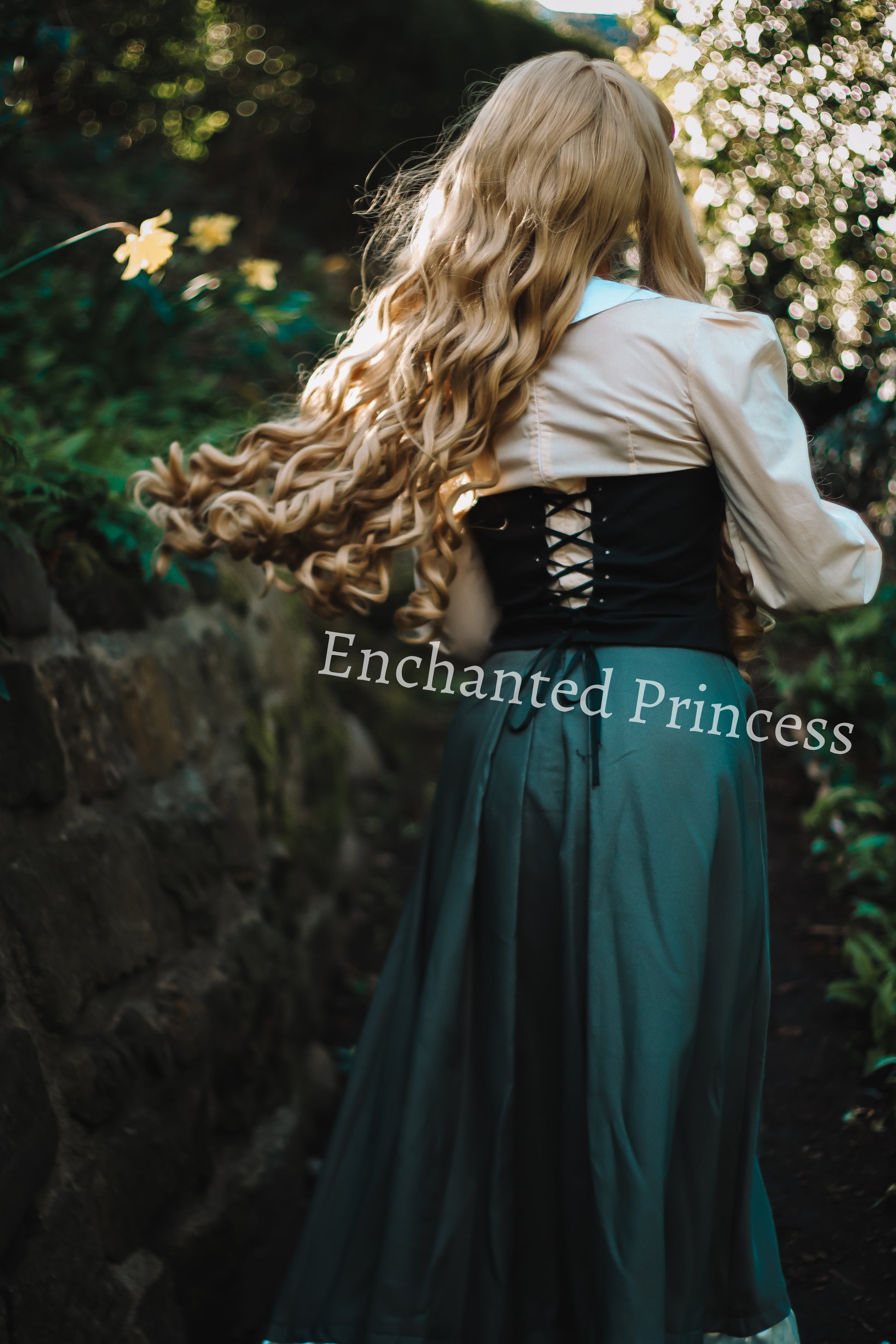 Her beautiful dress that comprises of a long sleeved shirt, a corset top that goes over the top ilof the shirt, and a skirt with an elasticated skirt.