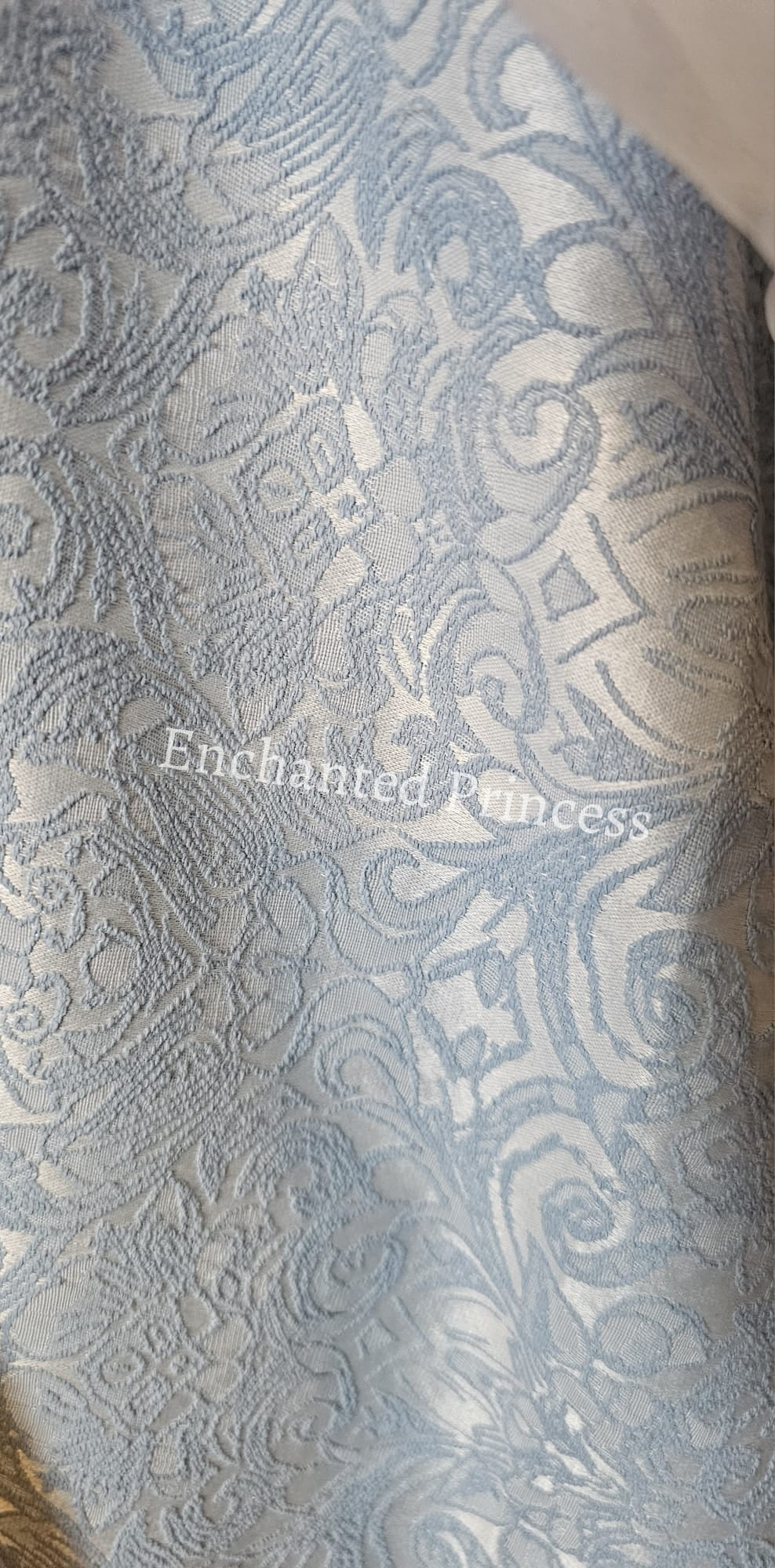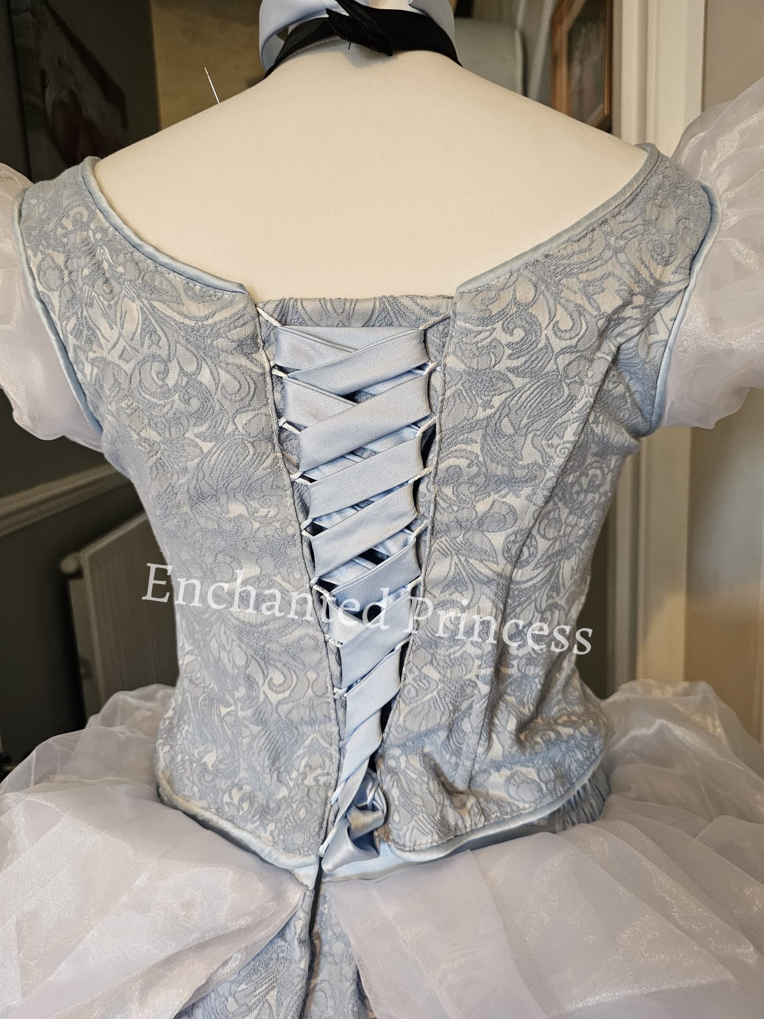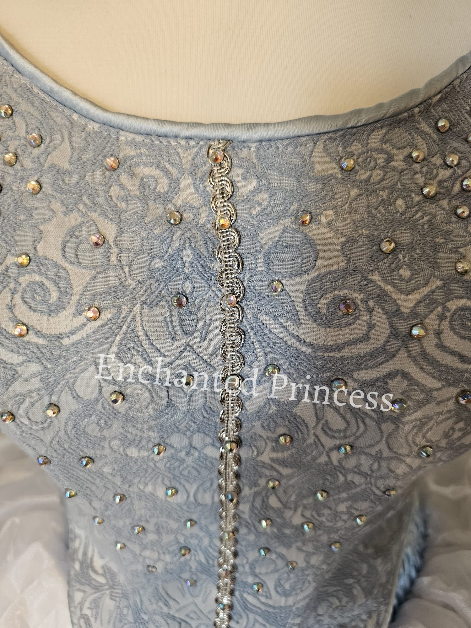 Cinderellas blue floral 2 part dress. The jacquard corset top has gorgeous puff shoulders design, in a polyester and satin like fabric. The details are stunning with a satin piping trim, silver details and scattered diamantes
