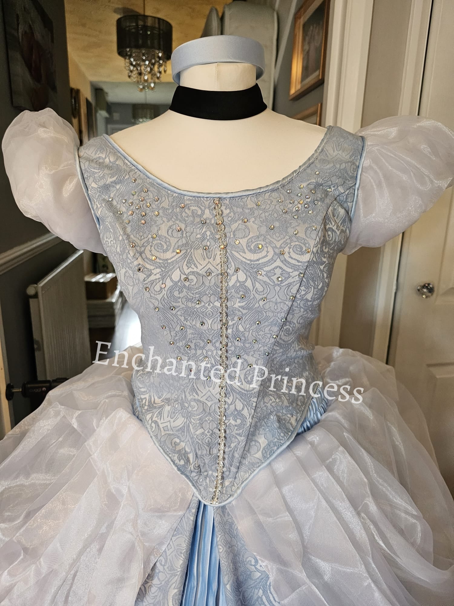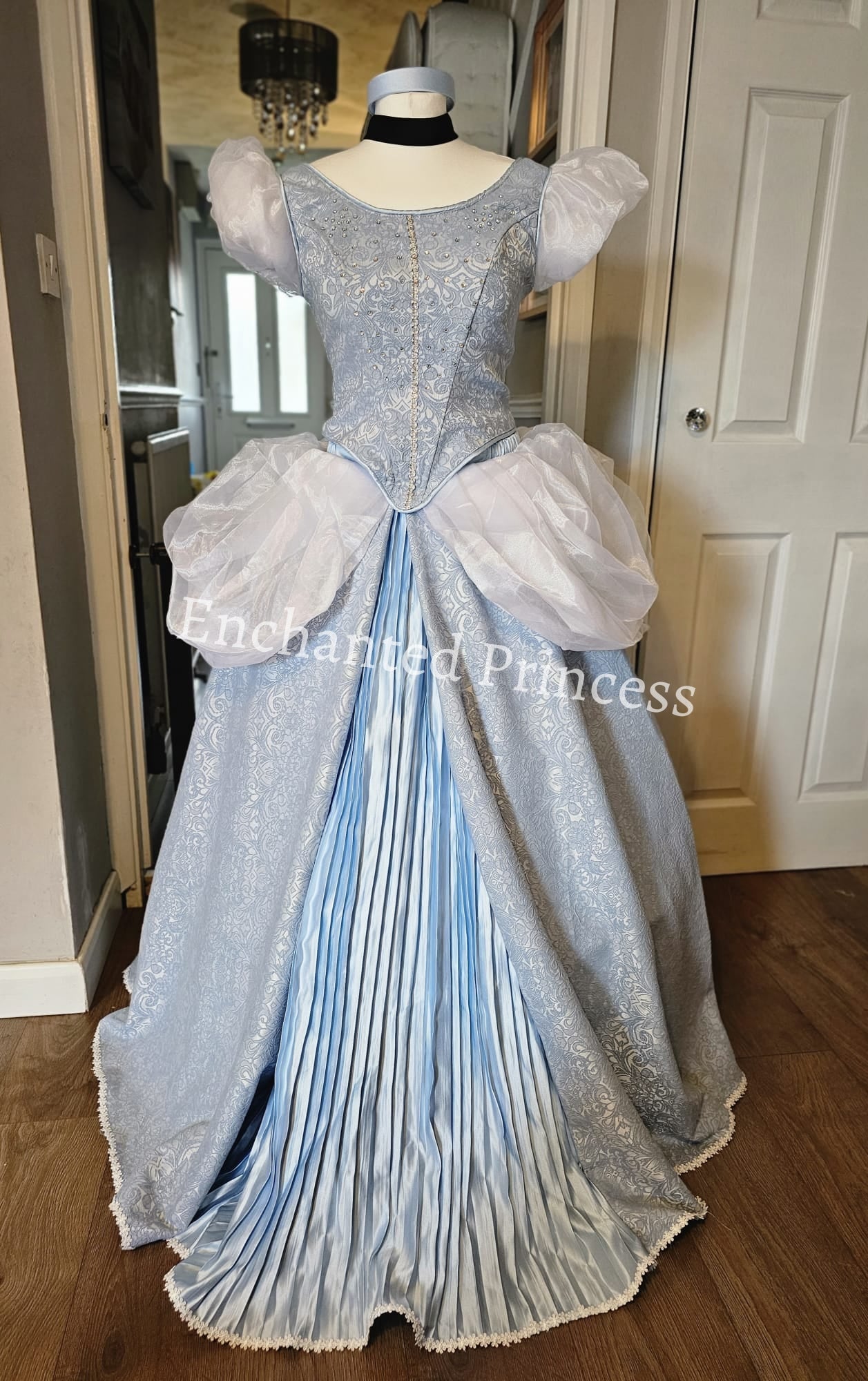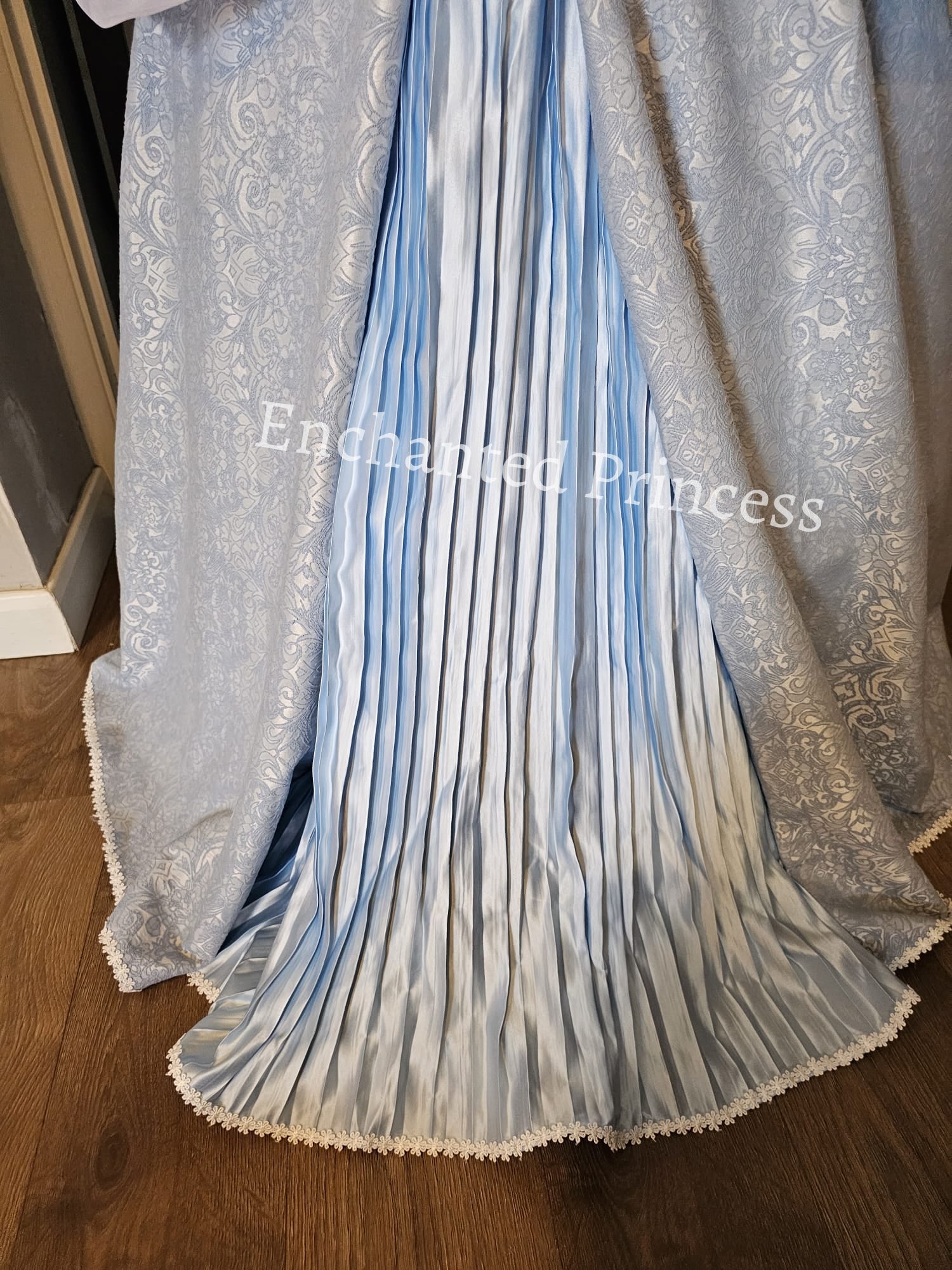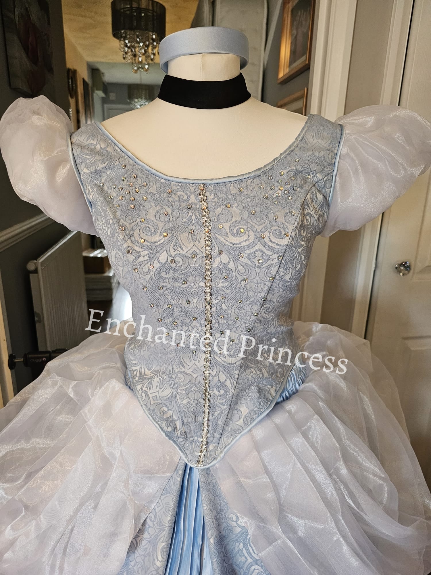 Cinderellas blue floral 2 part dress. The jacquard corset top has gorgeous puff shoulders design, in a polyester and satin like fabric. The details are stunning with a satin piping trim, silver details and scattered diamantes