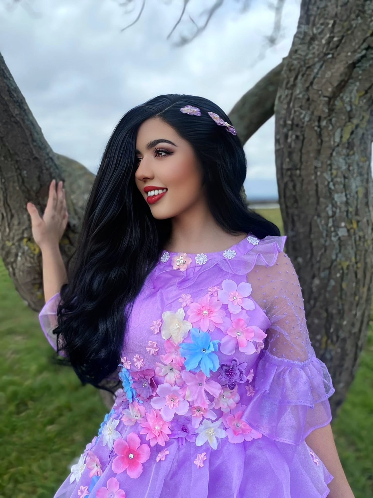 Gorgeous purple satin feel dress with the frills and flower details just like the movie.