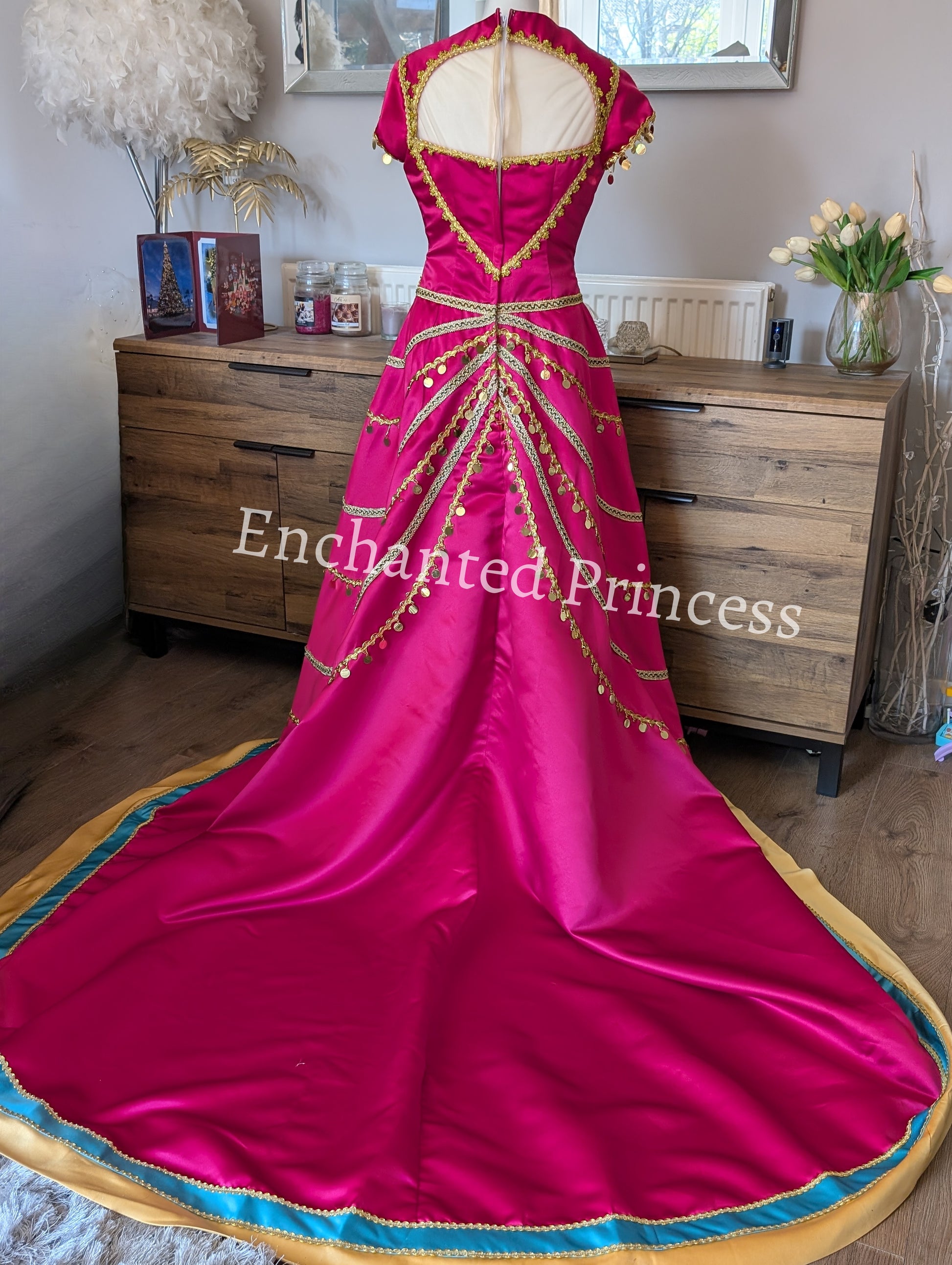 The front overskirt parts to reveal matching turquoise satin trousers with an elasticated waistband, combining comfort with Jasmine’s iconic style. The back features a flowing train for a dramatic, royal look.