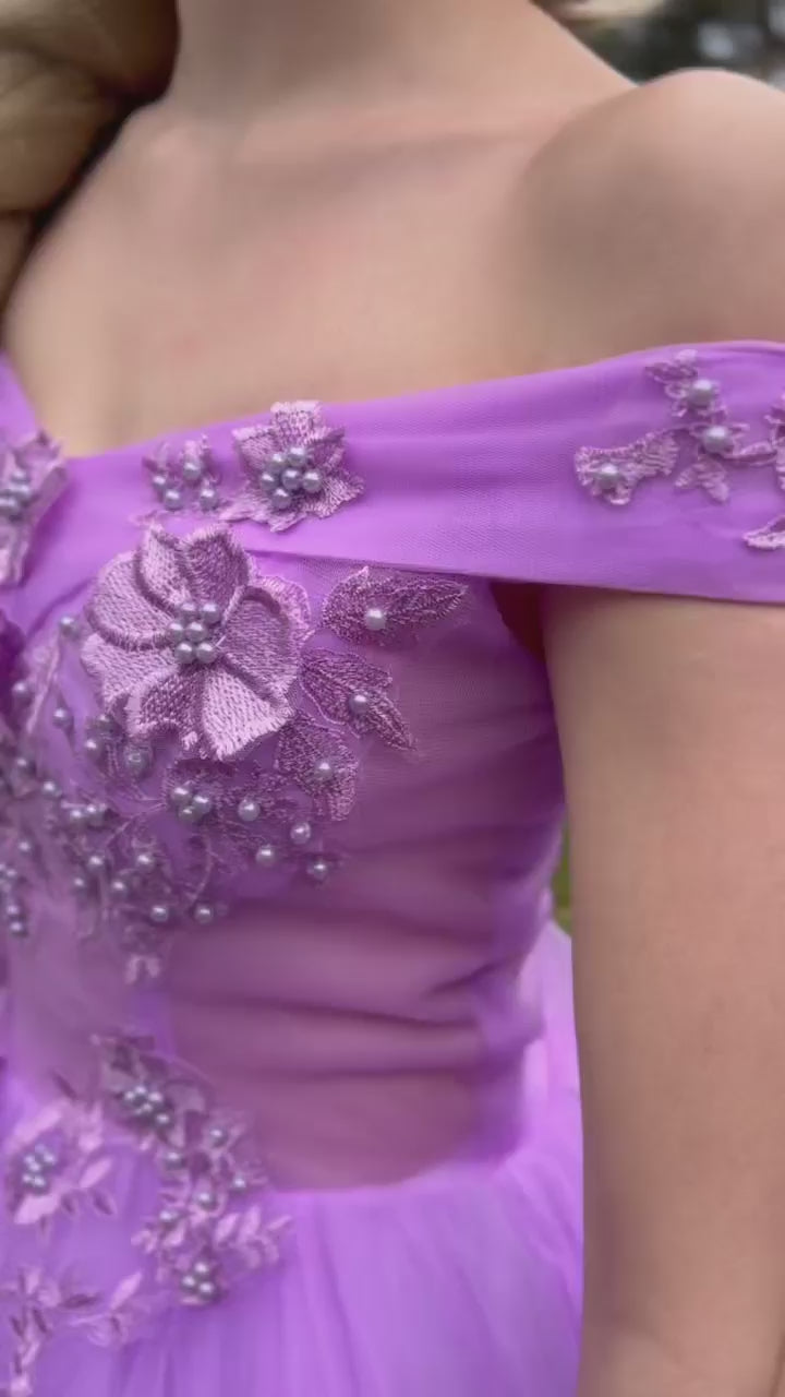 An off the shoulder design with a sweetheart neckline, with a corset back that is adjustable to loosen or tighten to your bust size.