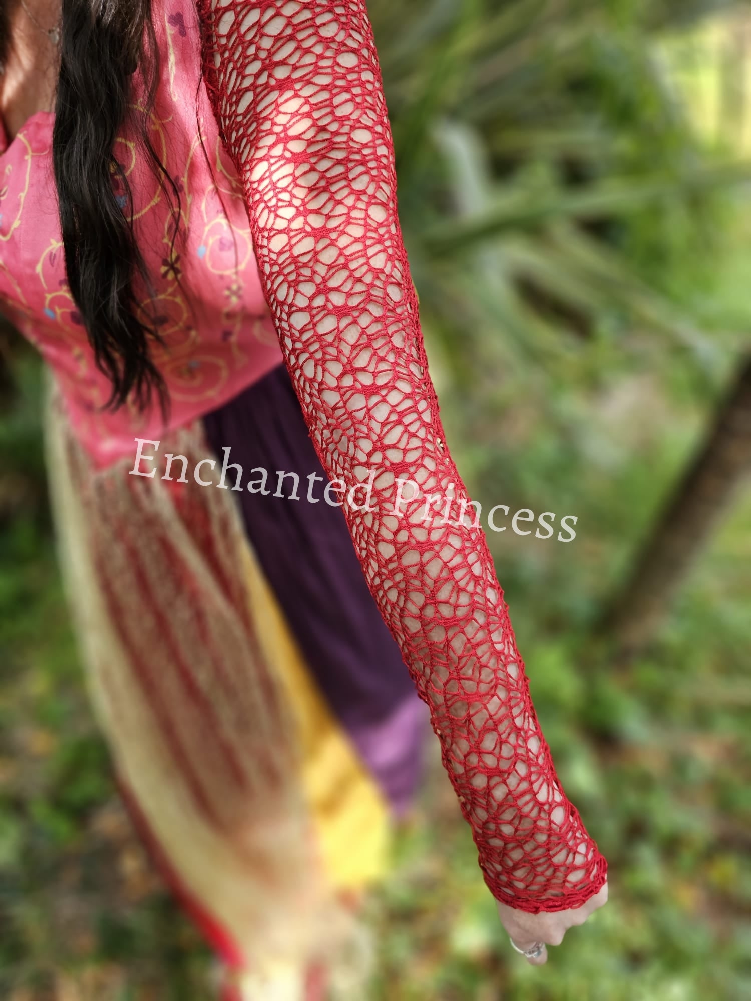 The sleeves are a crochet material, finished with a beautiful gold and plum skirt. The skirt is plum and gold with a gold netting overlay in the middle.